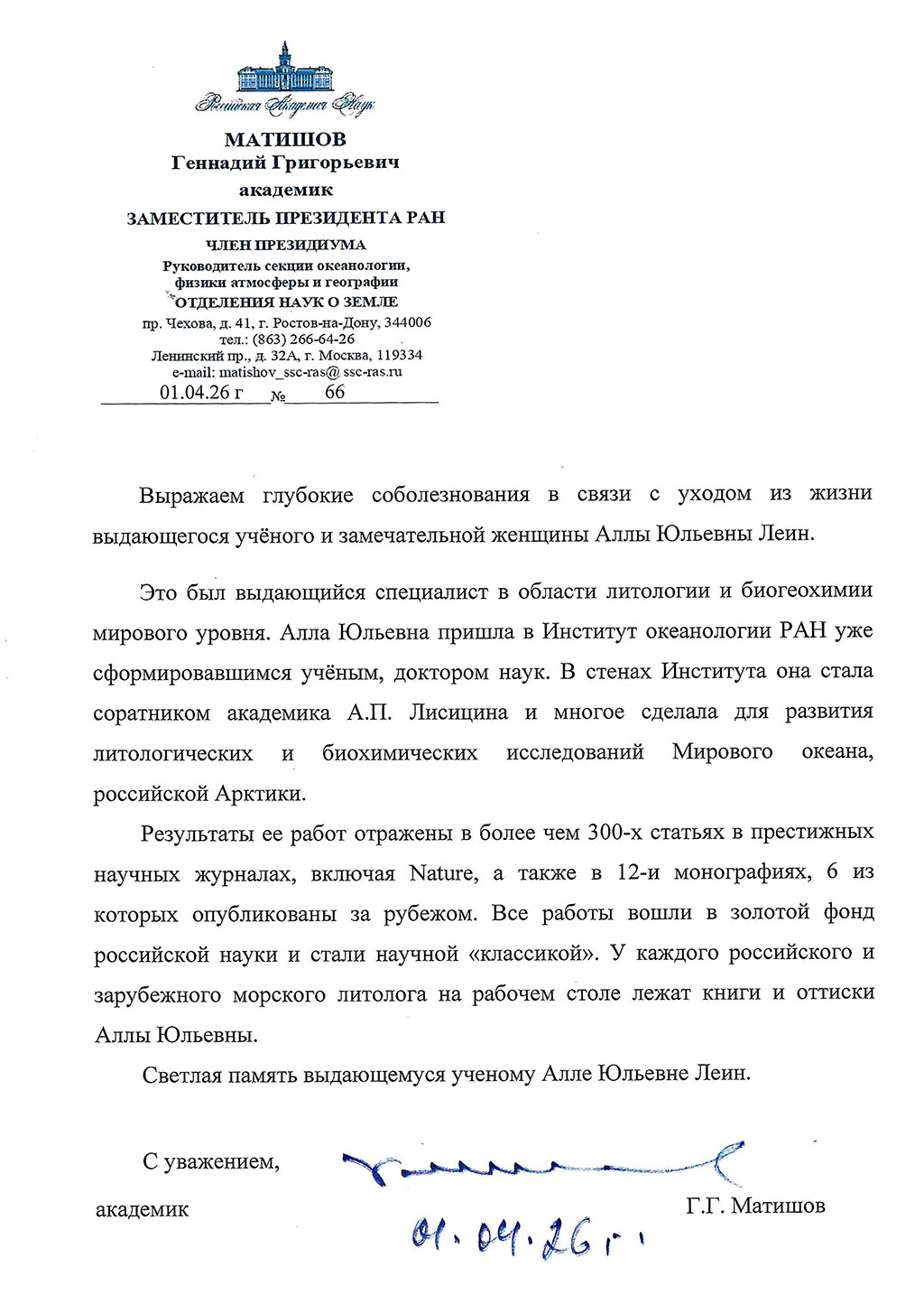 27 марта 2026 года ушла из жизни наша замечательная коллега, наставник, друг, уникальный человек, потрясающая женщина, выдающийся ученый с мировым именем, один из основателей нового научного направления, лауреат премии Правительства РФ, феноменальный литолог и биогеохимик, профессор А.Ю. Леин.