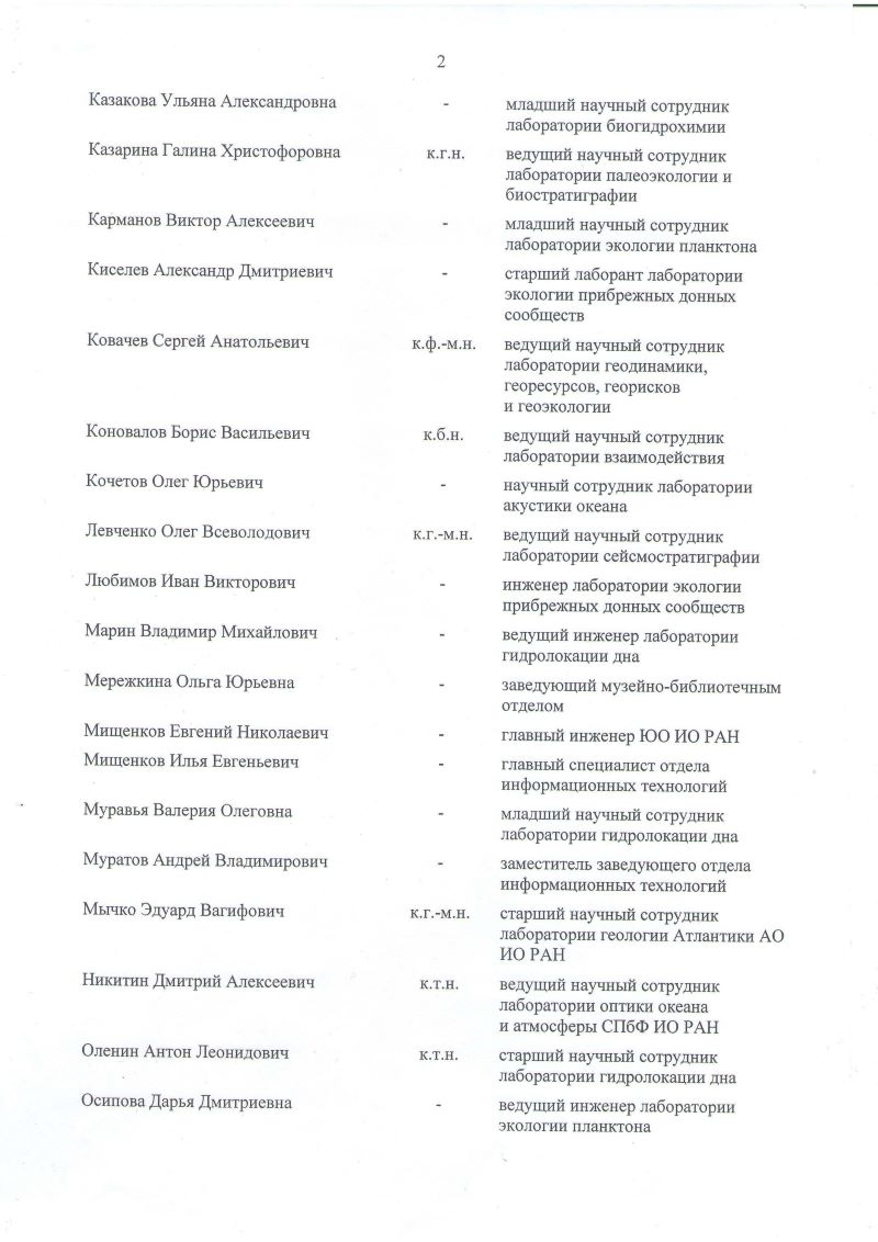 За заслуги в развитии отечественной науки, многолетнюю плодотворную деятельность объявить благодарность Отделения наук о Земле Российской академии наук ученым и специалистам структурных подразделений федерального государственного бюджетного учреждения науки Института океанологии им. П.П. Ширшова Российской академии наук (ИО РАН):