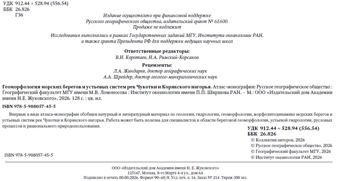 При поддержке Русского географического общества в издательстве ООО «Издательский дом Академии имени Н.Е. Жуковского» вышла в свет монография-атлас «Геоморфология морских берегов и устьевых систем рек Чукотки и Корякского нагорья», созданная коллективом авторов Географического факультета МГУ имени М.В. Ломоносова и Института океанологии имени П.П. Ширшова РАН. Автор идеи создания Атласа – В.Н. Коротаев.