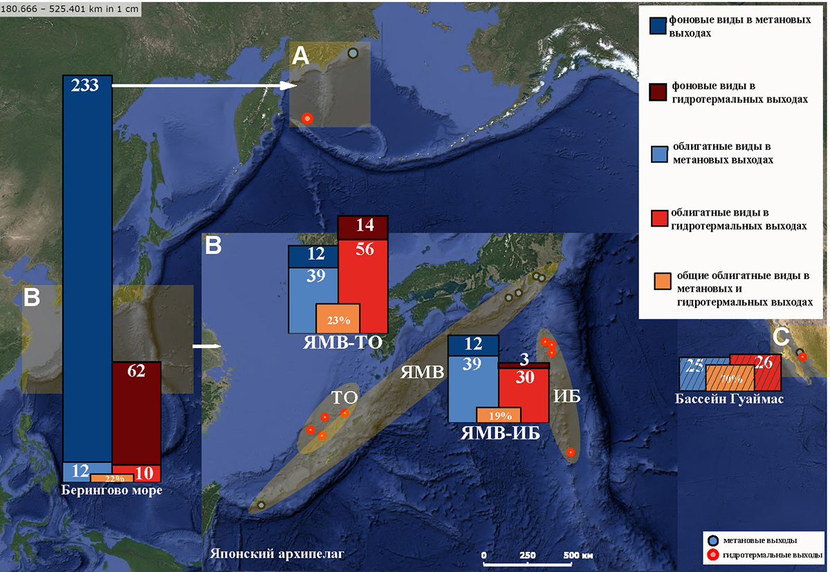 Был проведен сравнительный анализ региональных отличий фаунистического состава восстановительных биотопов Берингова моря и двух других регионов, вокруг Японского архипелага и в бассейне Гуаймас, для которых имеются литературные данные (Рисунок 1). В сравниваемых регионах метановые и гидротермальные выходы находятся в относительной близости друг от друга (60–1700 км) на сходных глубинах батиальной зоны в отсутствии значительных биогеографических границ. Фауна метановых и гидротермальных выходов в Беринговом море отличается низким числом облигатных (в т.ч. хемосимбиотрофных видов), а также низким числом облигатных таксонов надвидового уровня. Доля облигатных видов общих для метановых и гидротермальных выходов Берингова моря (22%) близка к значению для региона вокруг Японского архипелага (19–23%), но не достигает высоких предварительных оценок по сходству фауны в бассейне Гуаймас (70%). Региональные отличия в фаунистическом составе метановых и гидротермальных выходов могут быть связаны с относительно узким вертикальным диапазоном, малой глубиной и низким разнообразием биотопических условий в Беринговом море, а также с молодым возрастом гидротерм на вулкане Пийпа.