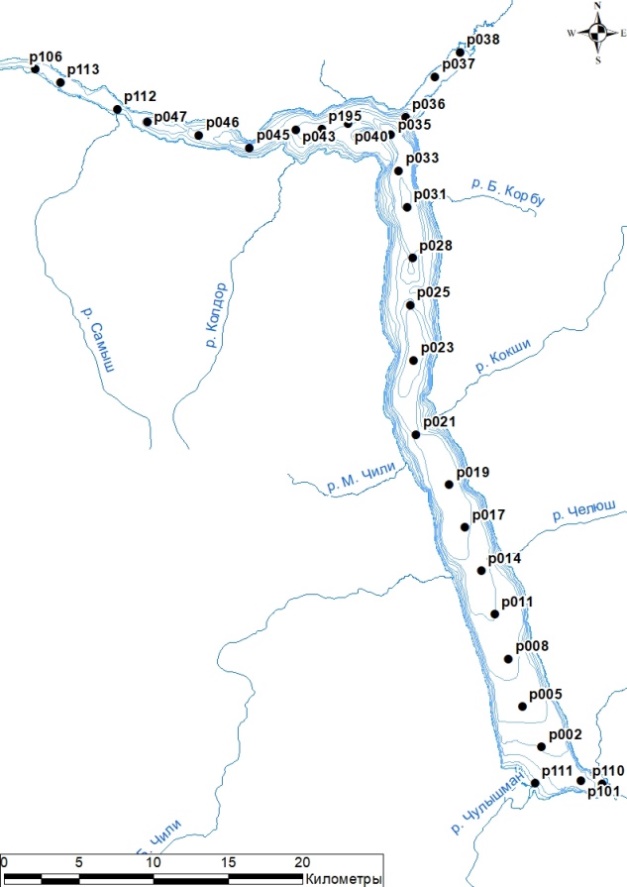 Было проведено рекогносцировочное обследование акватории озера, прилегающей к устью р. Чулышман и протоке Чебачьей с выполнением эхолотных промеров глубин, скоростей течения, распределения температуры и минерализации воды. Обследование проводилось для определения места долговременной постановки автономной буйковой станции с лебедочным зондом WP-03 и для измерений вертикальных профилей параметров водной среды в следующем экспедиционном сезоне. Установка зонда планируется в период весеннего половодья на р. Чулышман и развития термобара приемного водоема.