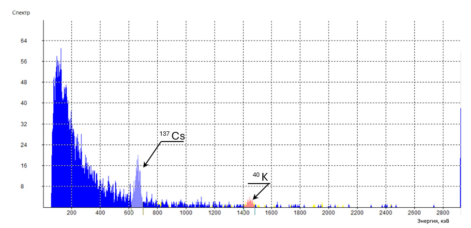 На рисунке показаны пики, соответствующие гамма-излучению техногенного