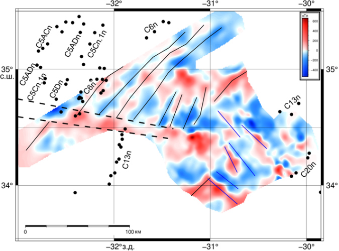 18. Детальная геомагнитная съемка на полигоне Атлантис показала, что спрединговые линейные магнитные аномалии здесь не сохранились. По-видимому, изначально сформированные на САХ линейные аномалии, впоследствии, в период образования плато, испытали разрушение или перекрытие под воздействием вторично излившихся магм.