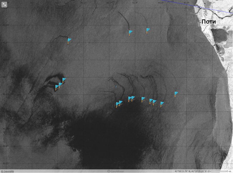 Кроме того, появились признаки усиления грифонной активности в юго-восточной и южной частях Черного моря. Речь идет о подводных источниках нефти, расположенных к востоку от г. Поти в грузинском секторе моря (рис. 3а, б), к СВ от г. Ризе и к северу от г. Унье в турецком секторе моря (последний бы обнаружен в 2011 г. также путем анализа совокупности РЛИ) (рис. 4). Об этом свидетельствует значительное увеличение площадей пятен, обнаруженных на поверхности моря над этими источниками, особенно в 2016 г. Более того, здесь заработали и прежде неизвестные мелкие источники нефти. Наконец, активизировался ряд газовых грифонов в Азовском море и на северо-восточном шельфе Черного моря - на ряде оптических снимков и РЛИ (2015-2106 гг.), имеющих лучшее разрешение по сравнению с РЛИ спутников Envisat и Radarsat-2 в широкообзорных режимах съемки, обнаружены характерные мелкие линейчатые пятна (рис. 5), которые по ряду признаков могут быть отнесены к естественным нефтепроявлениям. Вполне очевидно, что выходы газа здесь могут сопровождаться выбросами газоконденсата или даже нефти.