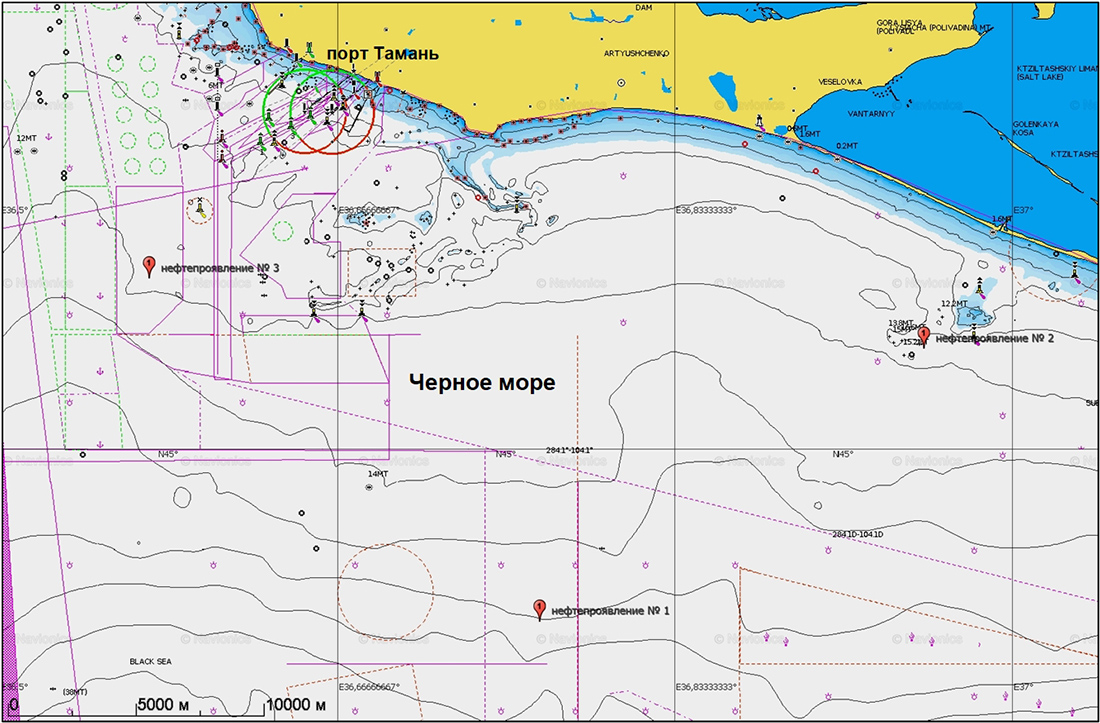 В ходе мониторинга в предпроливной зоне Черного моря на мелководном шельфе впервые обнаружены естественные нефтепроявления (рис. 3 и 6 показаны квадратиками; рис. 7). Так как нефтепроявления лежат в рамках Таманского нефтегазоносного района и Керченско-Таманской грязевулканической области, находятся недалеко друг от друга, а их появление на поверхности моря часто происходят одновременно, можно утверждать, что они принадлежат к одной и той же флюидодинамической системе. Скорее всего, к этой же системе относятся и недавно обнаруженное нефтепроявление в Азовском море и источник у Бугазской косы в Черном море [9, 10]. Анализ доступного геолого-геофизического материала привел к заключению, что эти нефтепроявления могут быть обусловлены существующей нефтегазоносностью и миграцией нефтеуглеводородов в осадочном комплексе северо-восточной части Черноморского бассейна.