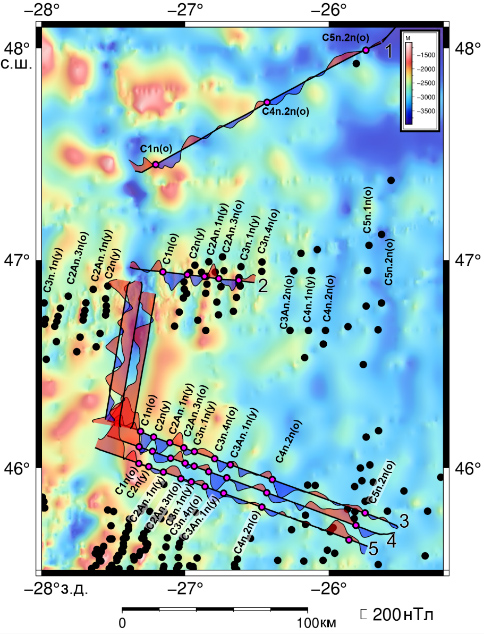 6. Впервые выделены спрединговые линейные магнитные аномалии между трогом Кинг и САХ в районе 46° с.ш., идентифицированные как хроны C1n-C5n.2n (0 – 11 млн лет). По выявленным хронам впервые были рассчитаны возраст океанической коры и скорость спрединга океанского дна. Скорость спрединга океанического дна в интервале 0 - 4 млн лет назад на широте 47° с.ш. была быстрее на 1 - 2 мм/год, чем таковая на широте 46° с.ш.